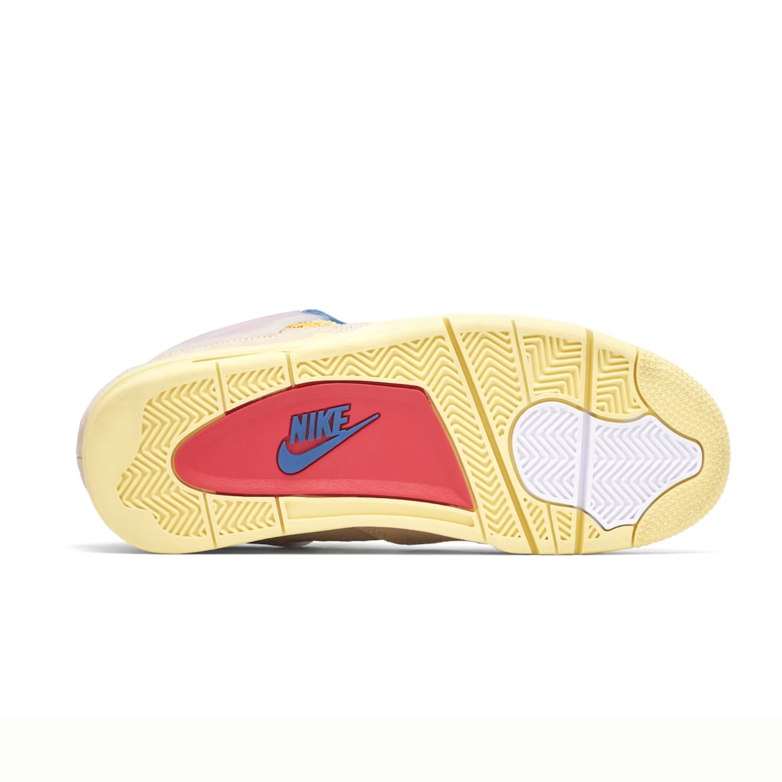 A vibrant collaborative sneaker between Union LA and Jordan Brand, this “Guava Ice” edition features a soft pink suede upper with breathable mesh on the toe and collar. The design includes semi-translucent TPU wings, a yellow Union tab on the quarter panel, and “Nike Air” branding on the heel clip. The tongue is folded down (a signature Union detail) but can be unstiched to reveal a traditional Jordan 4 tongue. The midsole and outsole have a vintage-inspired yellowed finish, completing the retro aesthetic.